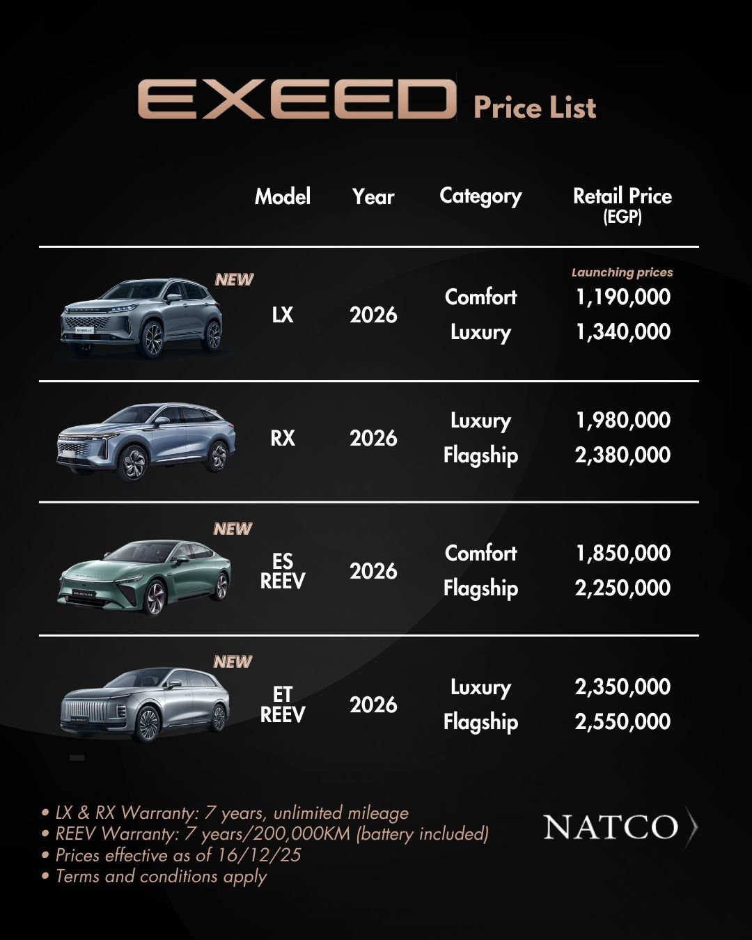 بأسعار تبدأ من مليون و 190 ألف جنيه،، طرح أحدث طرازين فاخرين للسيارة« EXEED ES» و« EXEED ET” 2026»