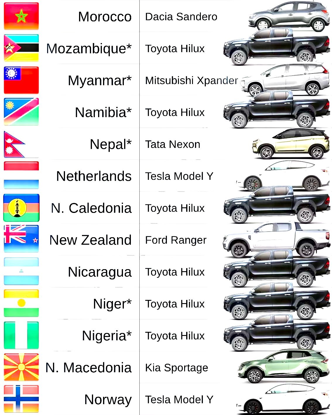 ويتناول التقرير أكثر سيارة مبيعاً في كل دول العالم حيث يتناول كل سوقٍ على حدة. ويظهر البحث فيقوائم السيارات المحلية بعض السيارات الرائدة غير المتوقعة، من بورشه 911 إلى رينو سانديرو، وتويوتاهيلوكس ، وكيا سبورتاج، وبي واي دي أتو 3. وتقوم هذه المخططات البيانية، التي جمعها محلل الصناعةفيليبي مونوز ، بتقسيم النموذج الأكثر مبيعًا في عشرات البلدان حول العالم لعام 2024.