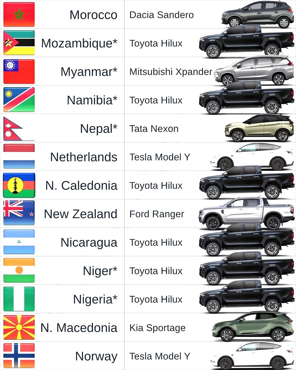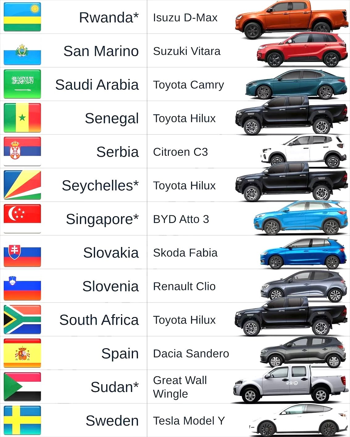 هناك أيضًا بعض السيارات التي ربما لم تتخيل يومًا أنها ستحظى بهذه الشعبية. على سبيل المثال، تُعدّسيارة جيلي كولراي، وهي سيارة كروس أوفر صغيرة، السيارة الجديدة الأكثر مبيعًا في بيلاروسيا، بينماتُعدّ جيتور X70 الأكثر مبيعًا في أنغولا. وفي إيران، سابيا كويك، وفي ساحل العاج، سوزوكي ديزاير، وفيماليزيا، تصدّرت بيرودوا بيزا قوائم السيارات العام الماضي.