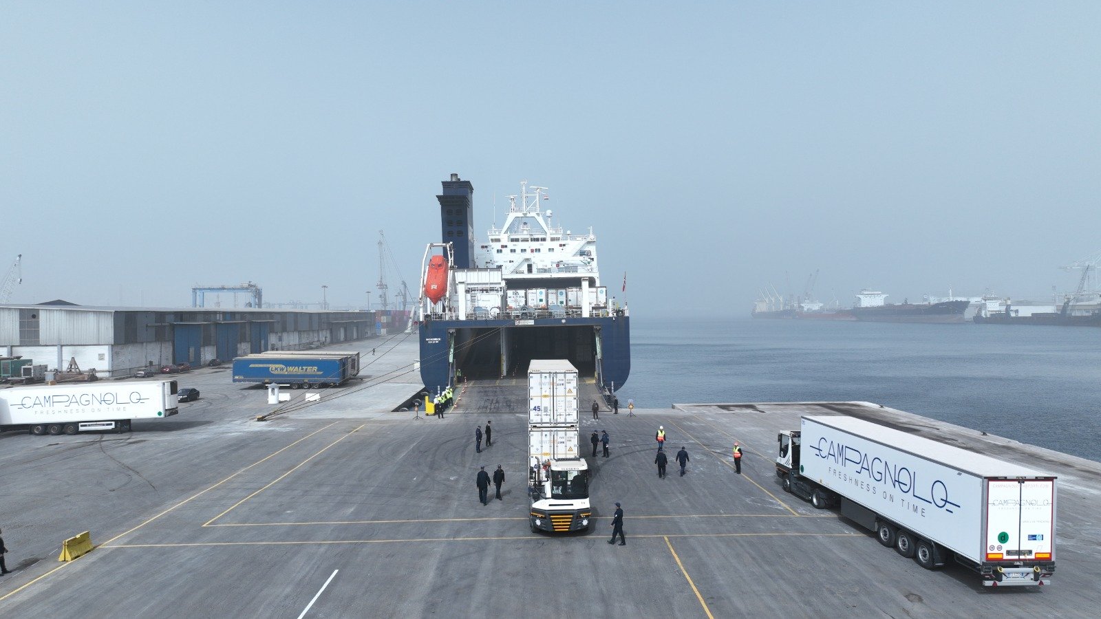حيث تفقد الوزير محطة الشحن البحري الخاصة بخط (الرورو) الرابط بين مينائى دمياط وتريستا الايطالى والتى تديرها مجموعة بان مارين ، حيث أطلع على أعمال التشغيل والتداول الى جانب الخدمات التى تقدمها المحطة لعملائها بالتزامن مع رسو سفينة الرورو OLYMPOS SEAWAYS والتي ترفع علم تركيا ( خلال رحلتها رقم 61 للميناء والمنتظر أن تقوم بتداول 4025.6 طن بضائع تشمل 1395.43 طن بضائع وارد و 2630.18 طن صادر عبارة عن ملابس ومنسوجات و قطع غيار سيارات وضفائر كهربائية و خضروات و فواكه طازجة ) .و حيث يمثل هذا الخط ركيزة أساسية لدعم حركة التجارة وزيادة الصادرات المصرية خاصة البضائع سريعة التلف ، وسرعة نفاذ البضائع المصرية الى الأسواق الأوروبية ، كما أطلع الوزير على إجمالي عدد الرحلات للخط منذ بدايته حتى الاًن والتي بلغت 60 رحلة بإجمالي تداول 143830 طن منهم 67885 طن وارد عبارة عن تفاح ومعدات متنوعة ، كما بلغ حجم البضائع الصادر 75945 طن فواكه وخضروات متنوعة وملابس و أقمشة و منسوجات و ضفائر كهربائية وقطع غيار سيارات .