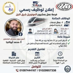 أعلنت شركة السكك الحديدية للخدمات المتكاملة وأعمال التأمين والنظافة، عن حاجتها للعمل بالمحطات والورش مشروع المونوريل شرق النيل للوظائف الآتية:-
