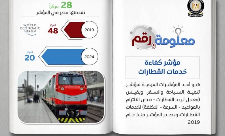 أعلن المركز الإعلامي لمجلس الوزراء عن تقدم مصر،28 مركزاً في مؤشر كفاءة خدمات القطارات ، إذ كانت مصر عام 2019 فى المركز 48، وأصبحت عام 2024 في المركز 20 فى فترة زمنية قصيرة .