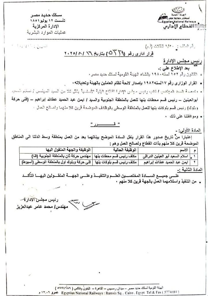 وكشف مستند رسمي حصلت « بوابة النقل الاخبارية » علي نسخة ويحمل رقم (5337) بتاريخ 16 أغسطس 2025، يقضي بنقل كل من المهندس إسلام السعيد أبو العينين – رئيس قسم محطات بنها للعمل بالمنطقة الجنوبية بقنا كمهندس حركة ثان ، أيمن عبد الحميد عطا الله إبراهيم – رئيس قسم بلوكات بنها،للعمل بالمنطقة الوسطى (أسيوط)، وتصمن القرار الإداري أن نقل المذكورين جاء حرصًا على انتظام العمل ومراعاة لمصلحة العمل .